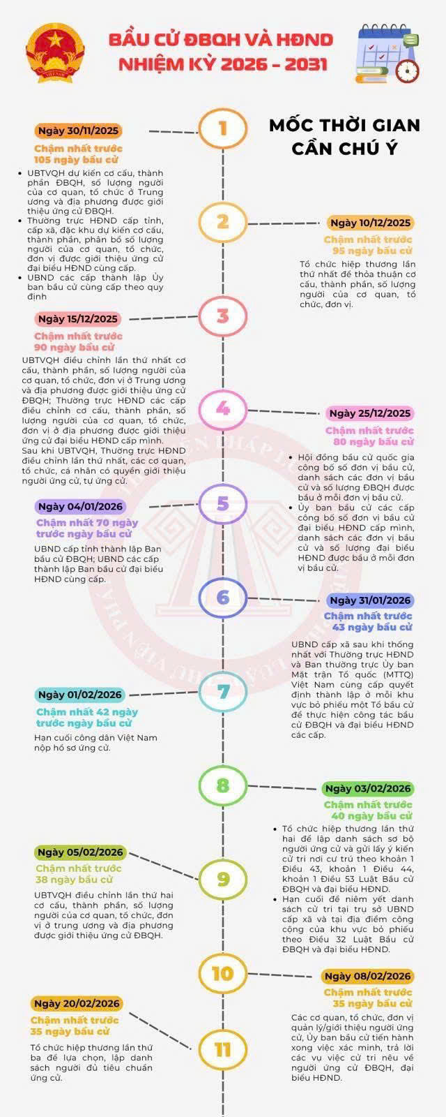 CÁC MỐC THỜI GIAN QUAN TRỌNG VỀ BẦU CỬ ĐẠI BIỂU QUỐC HỘI VÀ HỘI ĐỒNG NHÂN DÂN NHIỆM KỲ 2026-2031
