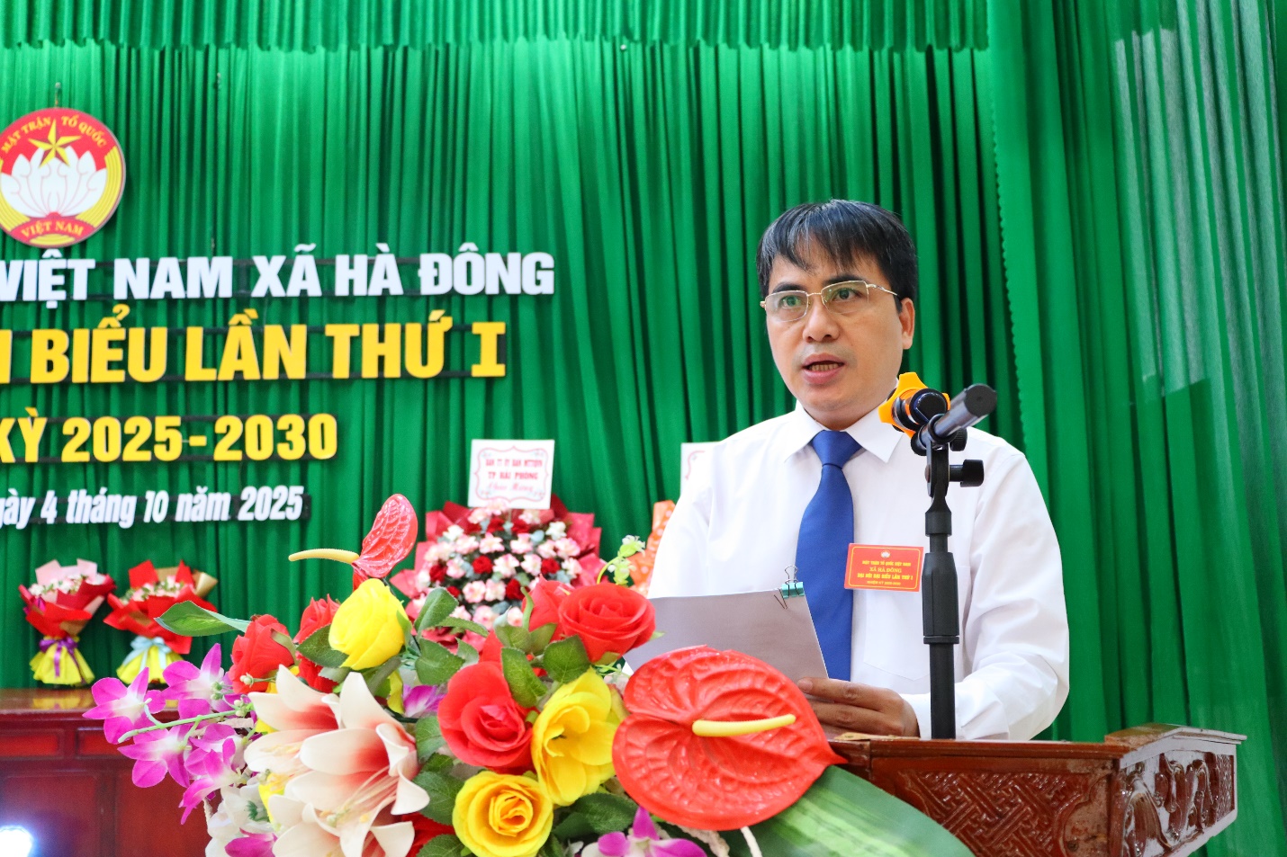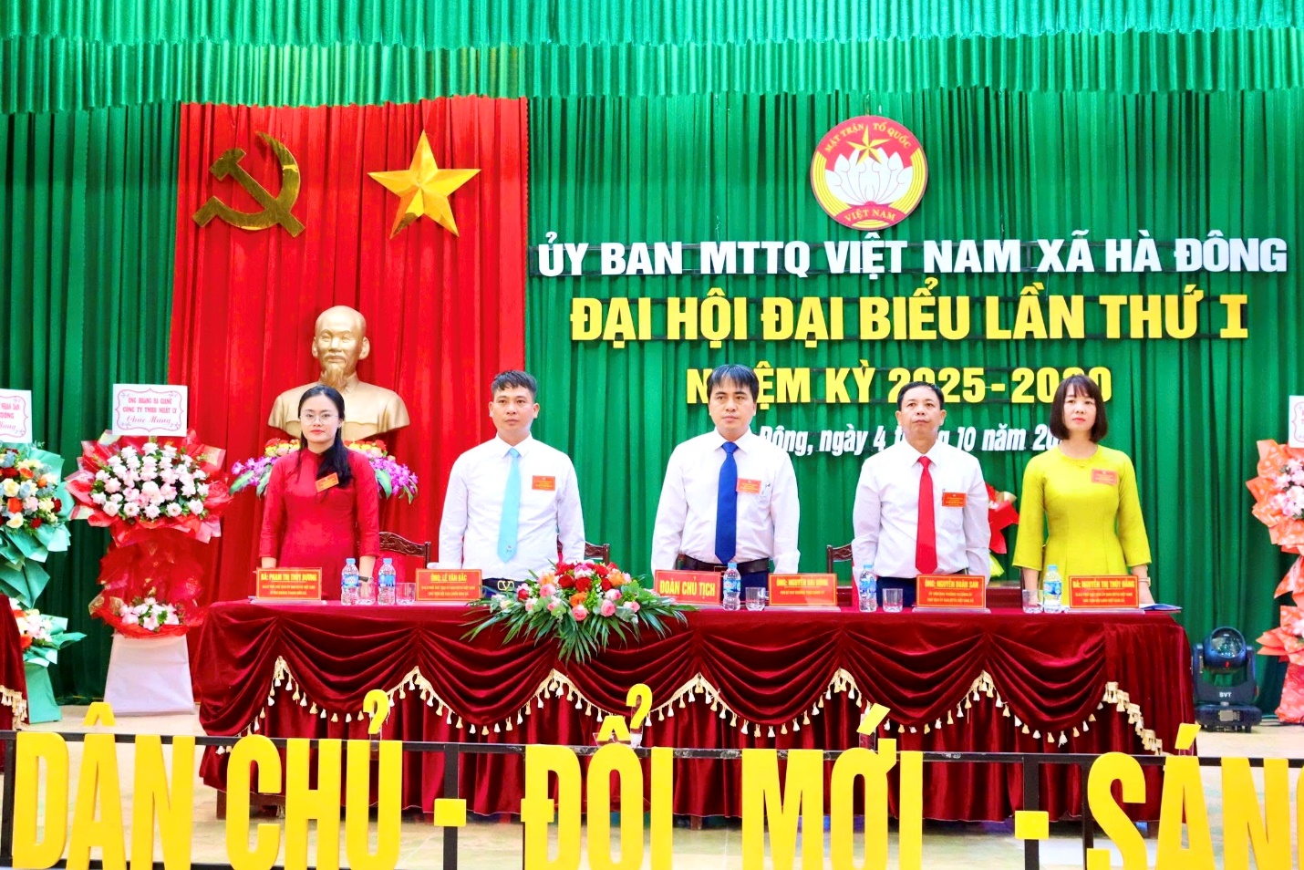 Với phương châm “Đoàn kết – Dân chủ – Đổi mới – Sáng tạo – Phát triển”, Đại hội MTTQ xã Hà Đông lần thứ I, nhiệm kỳ 2025- 2030 Đại hội hiệp thương cử Uỷ ban MTTQ Việt Nam xã khoá I gồm 54 ủy viên. Ủy ban MTTQ Việt Nam xã Hà Đông đã tổ chức phiên họp thứ nhất, nhiệm kỳ 2025 – 2030 để hiệp thương cử chức danh Chủ tịch, các Phó Chủ tịch. Kết quả Ban Thường trực Ủy ban MTTQ Việt Nam xã khóa I, nhiệm kỳ 2025-2030 gồm 5 người. Ông Nguyễn Doãn San – UVBTV ĐU, tiếp tục giữ chức Chủ tịch UBMTTQ xã khóa I, nhiệm kỳ 2025-2030. Các ông Bà Nguyễn Thị Thúy Hằng, Đảng ủy viên; Phạm Thị Thuỳ Dương, Đảng ủy viên; Lê Văn Bắc, Đảng ủy viên; Lê Đình Minh Đảng ủy viên giữ chức Phó Chủ tịch UBMTTQ xã khóa I, nhiệm kỳ 2025-2030.