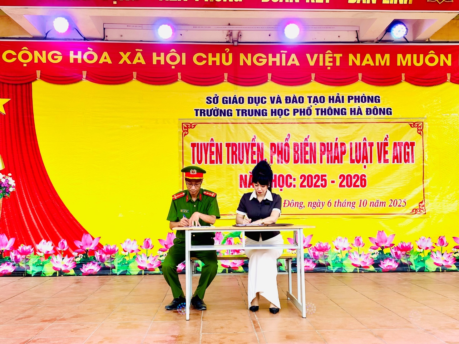 Đại diện hai đơn vị ký cam kết thực hiện nghiêm quy định, không để học sinh vi phạm trật tự an toàn giao thông